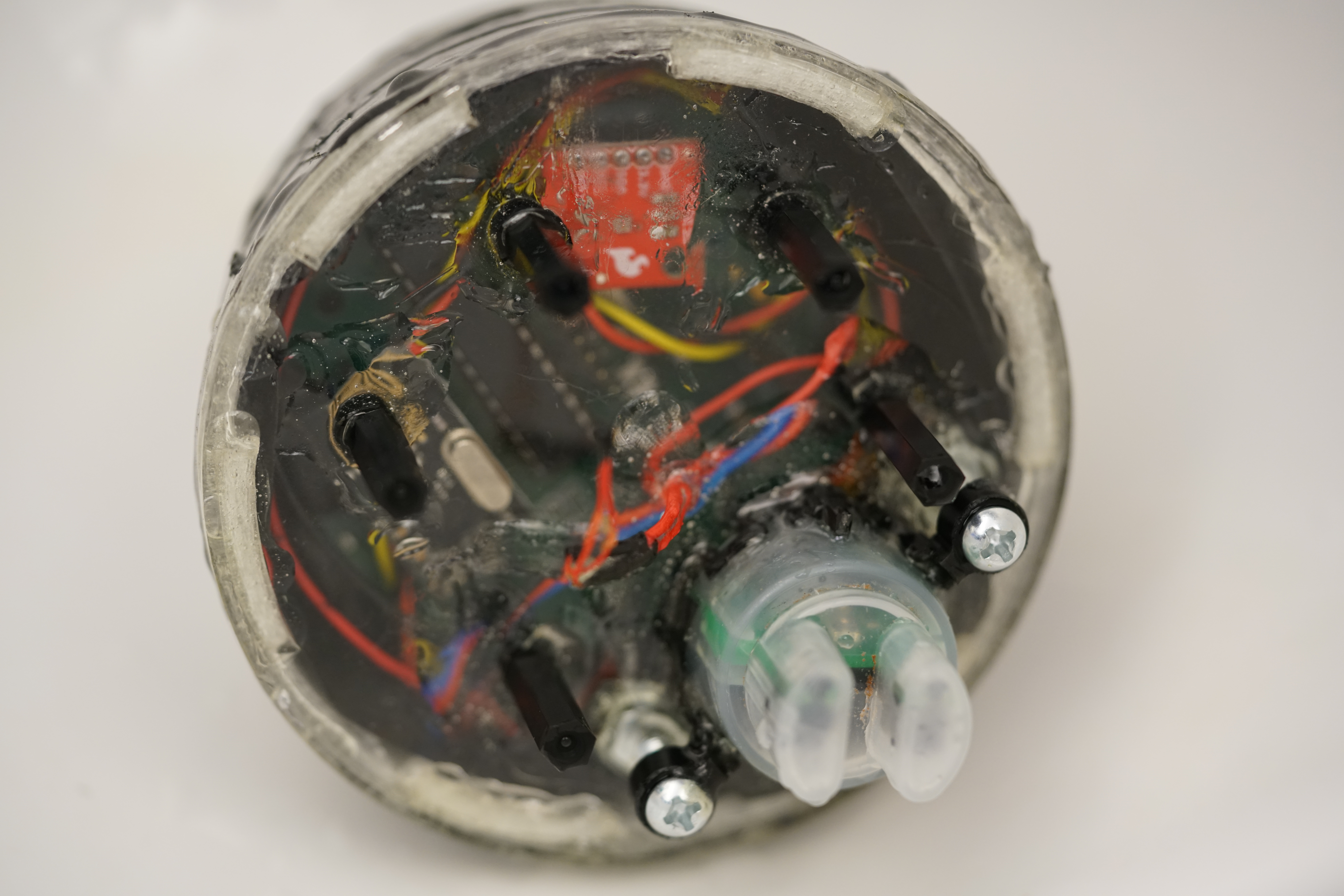 The puck design consists of a 3d printed enclosure, sealed with epoxy, surrounding a custom PCB which houses the sensors, radio, and MCU. Inside, above the PCB is a space for the batteries, as well as the breakout board for the turbidity sensor. The individual components are labeled below, as well as a fun picture of the bottom of the puck.